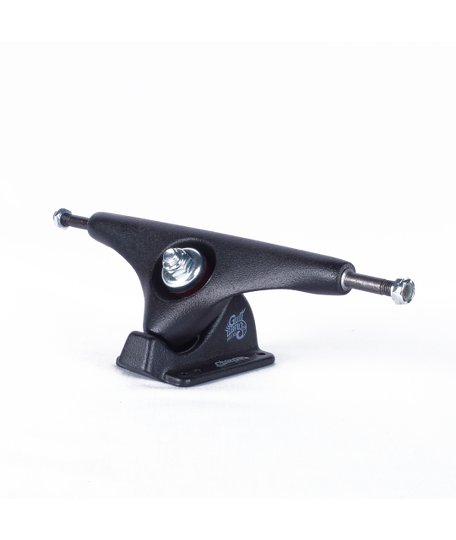 The Gullwing Charger 10" Black trucks are designed for carving, cruising, downhill, freeriding, and freestyle. Cast with aluminum, the hanger measures 7.32" long with a 10" axle length. With a 50 degree baseplate for a tight turing radius, the double tall cone bushings produce deep carves.