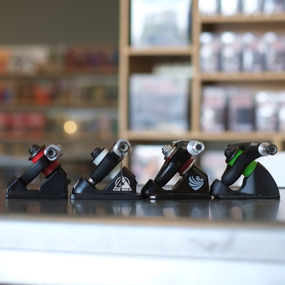 A lower baseplate angle (44°) increases stability, making it ideal for downhill or high speed freeriding. The lower angles will bring the hanger closer to the deck, increasing the chance of wheel contact. To learn how to avoid wheel bite, read next weeks article.